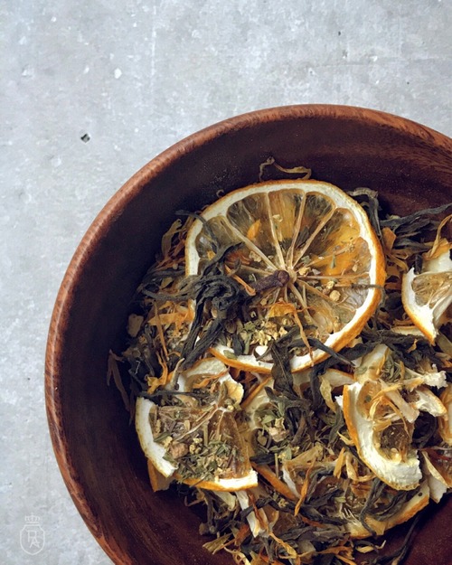 みかん(小夏)、プーアル茶、ビターオレンジ果皮、レモンタイム、エルダーフラワー、マリーゴールド、クローブ、生姜